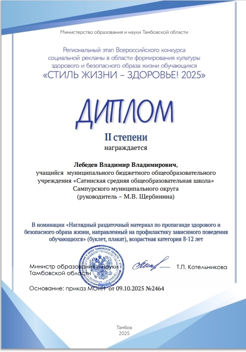 В Сатинской школе Сампурского муниципального округа состоялось торжественное награждение Алёны Соломатиной, ученицы 11 класса, ставшей призёром Всероссийского конкурса литературного творчества «Человек доброй воли» и победителем регионального этапа этого же конкурса. Торжественная церемония награждения прошла при участии заместителя председателя Тамбовского отделения ВДПО Ирины Киселёвой. Она вручила Алёне грамоты и призы, поздравив её и руководителя, Якунину Ирину Михайловну, с заслуженной победой и отметив их стремление к общественному служению. Главная задача конкурса — раскрыть творческий потенциал юных талантов и педагогов, а также укрепить гражданско-патриотические ценности у подрастающего поколения. Конкурс направлен на повышение осведомлённости детей и подростков о правилах пожарной безопасности, формирование у них навыков безопасного поведения в чрезвычайных ситуациях, воспитание ответственного отношения к собственной безопасности и безопасности окружающих. Кроме того, он призван стимулировать интеллектуальное развитие одарённых детей и помогать им в выборе будущей профессии. |